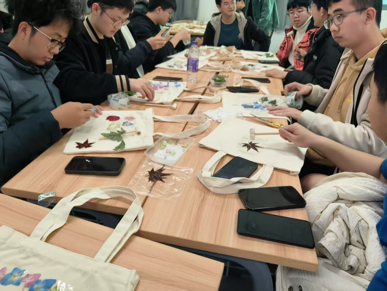 团支书于雪琪将提前购置的樱花、枫叶、蕨类等二十余种植物分列于桌面。叶片脉络如河网纵横,花瓣纹理似涟漪轻漾,每一份自然馈赠皆被赋予独特的艺术语言。同学们俯身挑选心仪草木,或托起一片银杏端详其扇形弧度,或轻抚三色堇感叹其蝶翼般的轻盈。“原来水利人的浪漫,不仅是治水安澜,还能从一草一木中读懂自然的密码。”指导老师现场演示拓印技法:棉布浸润明矾固色,叶片覆于其上,裹以素纱,木槌轻敲间汁液缓缓渗染,顷刻便拓出深浅交织的草木印记。