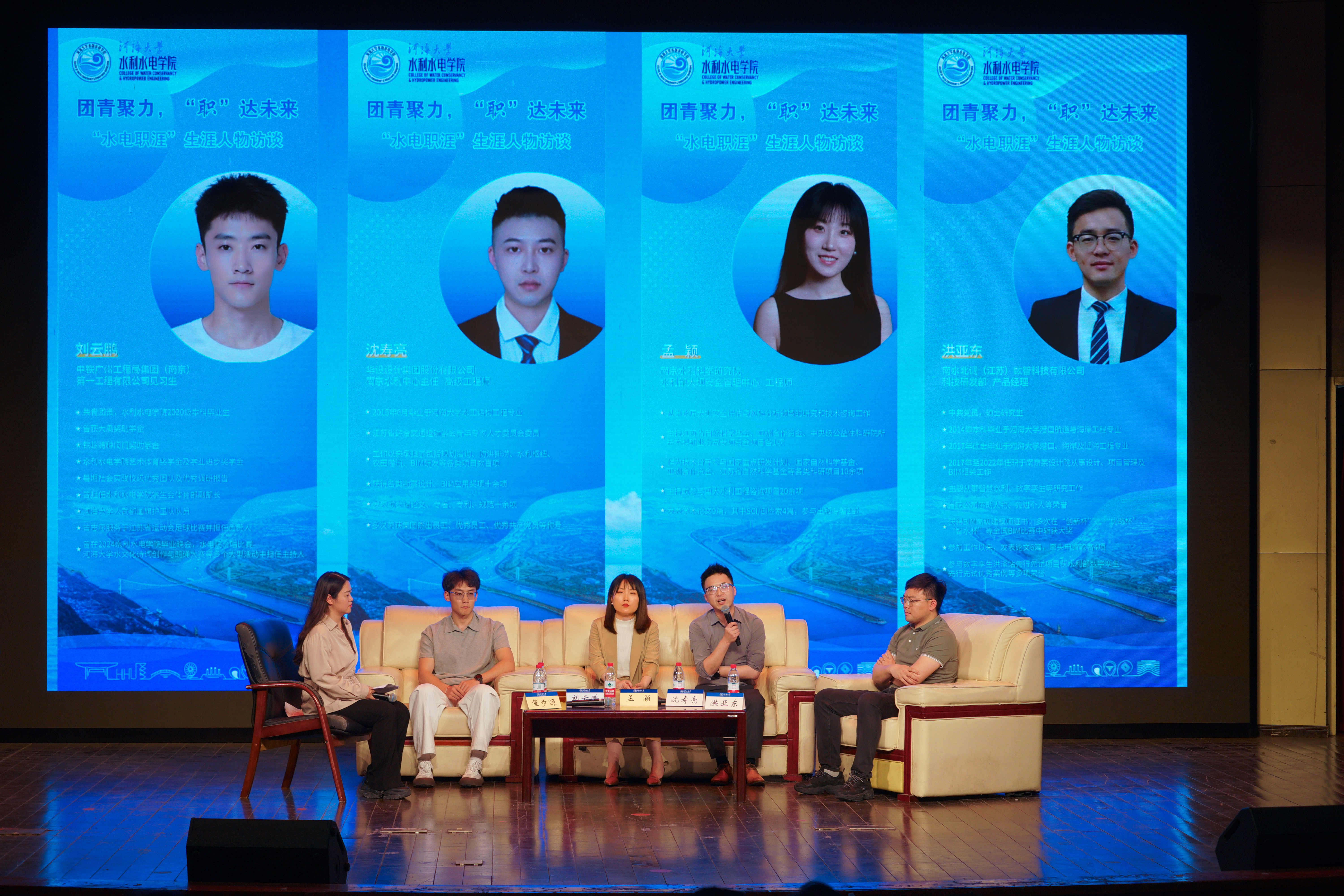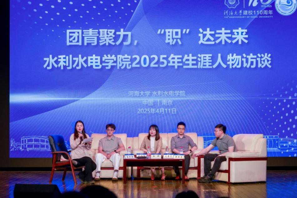 为助力学生明晰职业方向、深化行业认知, 高辣文 于2025年4月11日晚在博学楼报告厅举办“团青聚力,‘职’达未来”生涯人物访谈活动。活动特邀华设设计集团南京水利中心主任沈寿亮、南京水利科学研究院工程师孟颖、南水北调(江苏)数智科技有限公司产品经理洪亚东、中铁广州工程局见习生刘云鹏四位校友,围绕职业规划、行业趋势与成长路径展开深度对话。四位嘉宾分别来自设计、科研、科技企业与工程一线,其多元背景为在场学生提供了多维度的行业视角。2024级全体本科生参加,访谈由2024级辅导员笪步源主持。