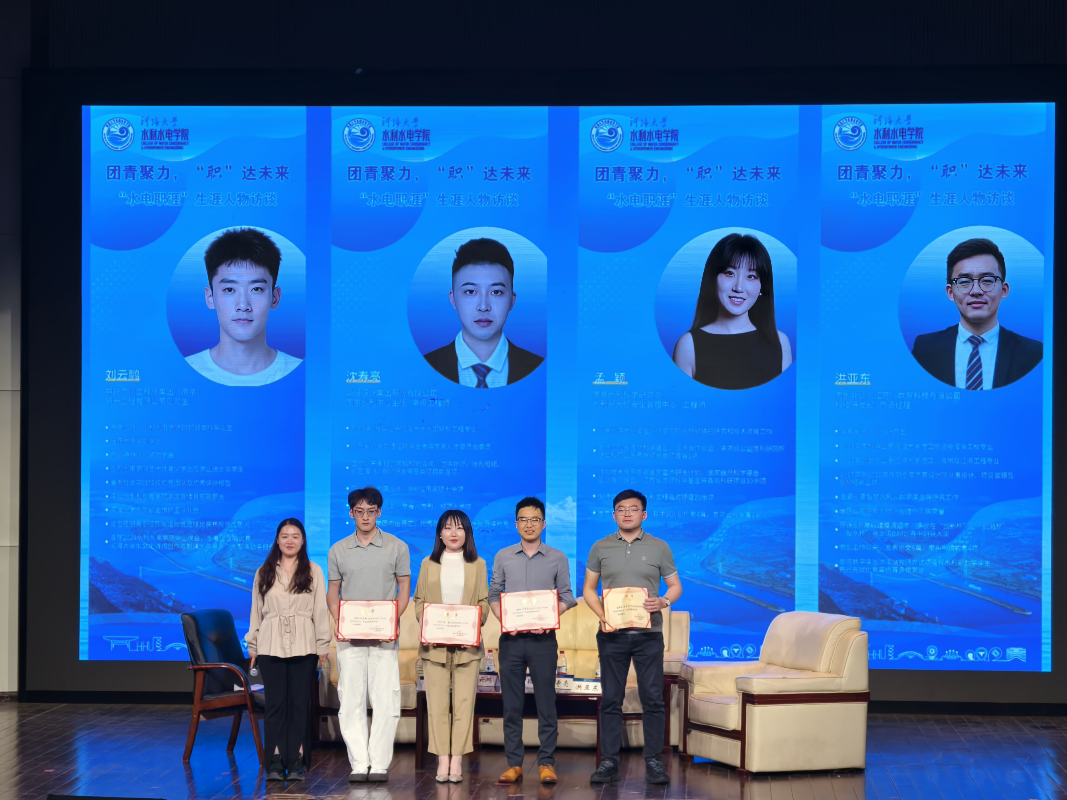 访谈最后,2024级在校学生代表为四位嘉宾颁发聘书,聘请四位校友担任高辣文 水电院学生生涯发展特聘导师,并合影留念。