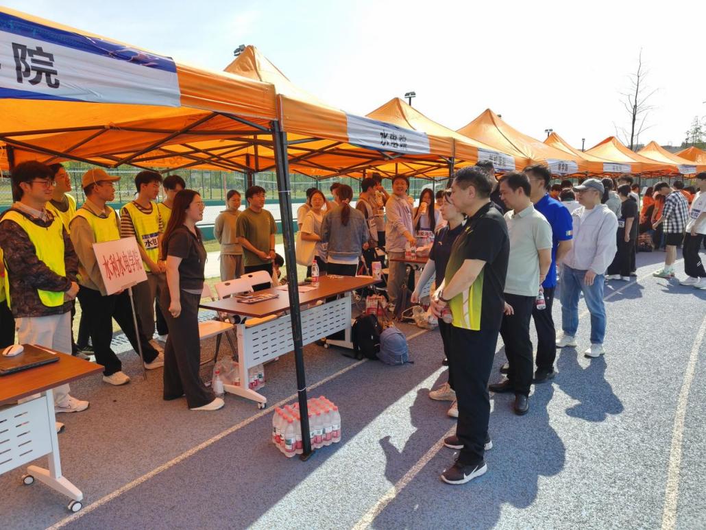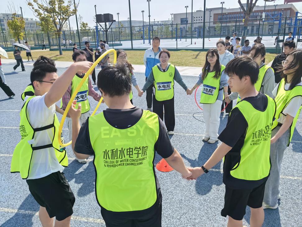 16:00,压轴项目“拔河”将比赛推向高潮。水电院派出10名男生和10名女生,在指挥员的带领下与对手展开激烈较量。比赛开始后,队员们紧握绳索,身体后倾,全力向后拉拽。现场加油声此起彼伏,双方僵持不下。尽管水电院最终未能晋级八强,但队员们拼尽全力的表现赢得了对手和观众的尊重。