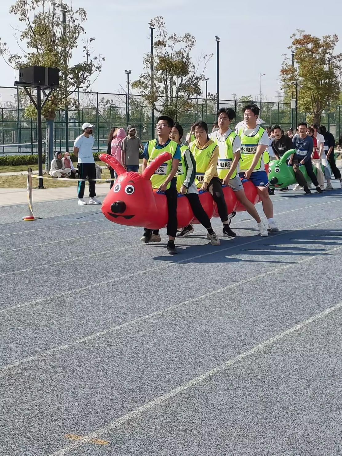 15:00,“毛毛虫”项目正开始。水电院的5名队员(3男2女)骑在充气毛毛虫上,双手紧握把手,随着裁判一声令下,队员们步伐一致,奋力向前冲刺。比赛中,队员们高喊口号,保持节奏,确保器械不触地。尽管对手实力强劲,但水电院凭借出色的配合顺利完成50米赛程,赢得了现场观众的阵阵欢呼。
