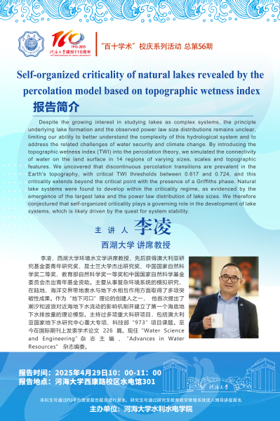 学术报告 | Self-organized criticality of natural lakes revealed by the percolation model based on topographic wetness index