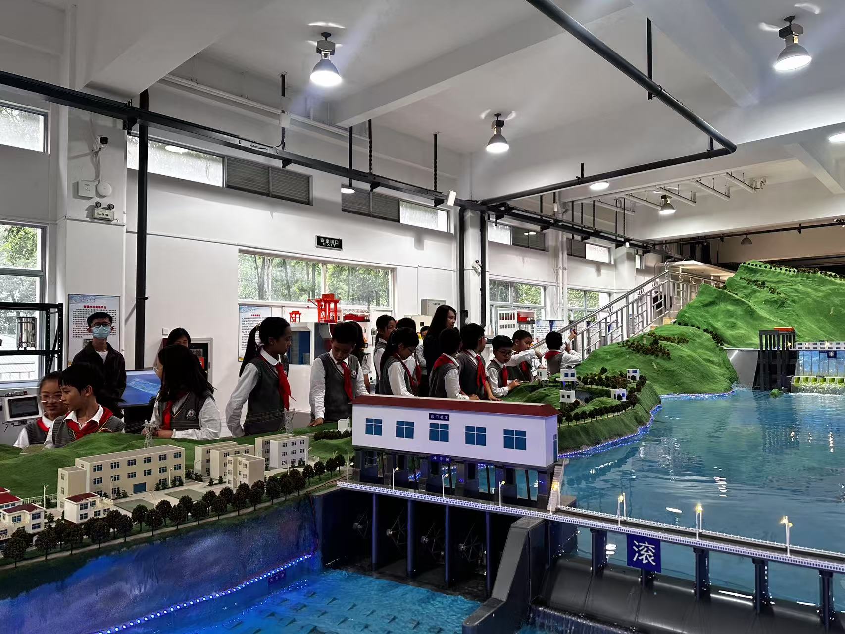 在实验室参观环节,同学们近距离观察了水利工程模型、智能监测设备、VR等教学装置。实验中心特别设计的水下机器人操作演示引发阵阵惊叹,水流模拟实验台前,孩子们通过亲手调节参数直观认知流体力学原理。互动问答环节中,实验中心人员以通俗易懂的方式解答了大坝如何防洪水力发电原理等专业问题,现场气氛热烈。