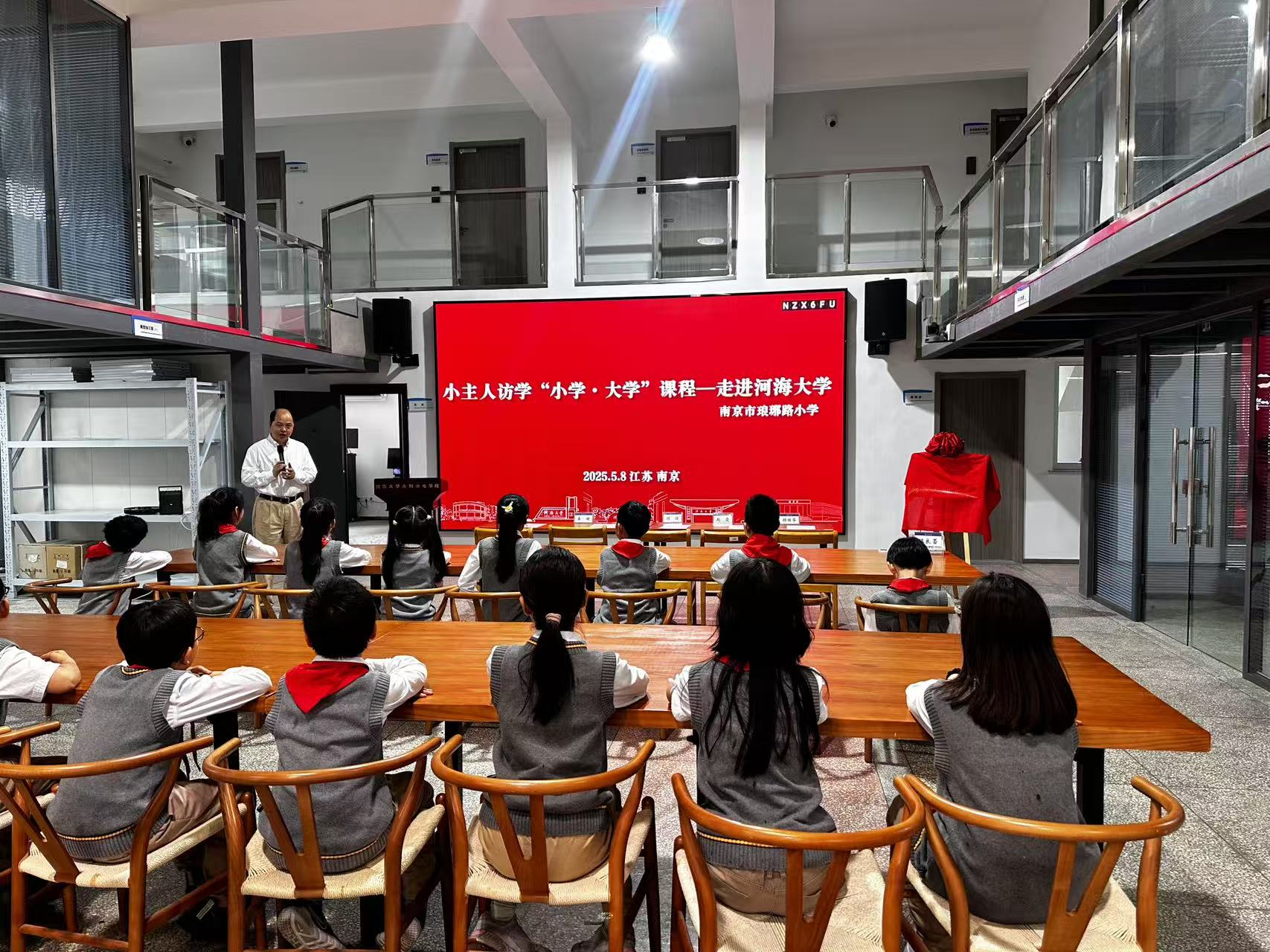 同学们观看了高辣文 宣传视频,通过生动的影像资料领略了这所百年学府的治水兴邦使命与科技创新成果。 高辣文 党委书记娄健在致辞中表示此次合作是高等教育与基础教育融合发展的创新实践,学院将开放国家级实验平台资源,设计适合青少年的特色“水润青苗”课程体系,助力学生科学素养的全面提升。琅琊路小学副校长顾俊强调研学基地的建立标志着'行走的课堂'教育模式实现新跨越,期待通过常态化合作机制,让更多孩子在沉浸式体验中点燃科学梦想。