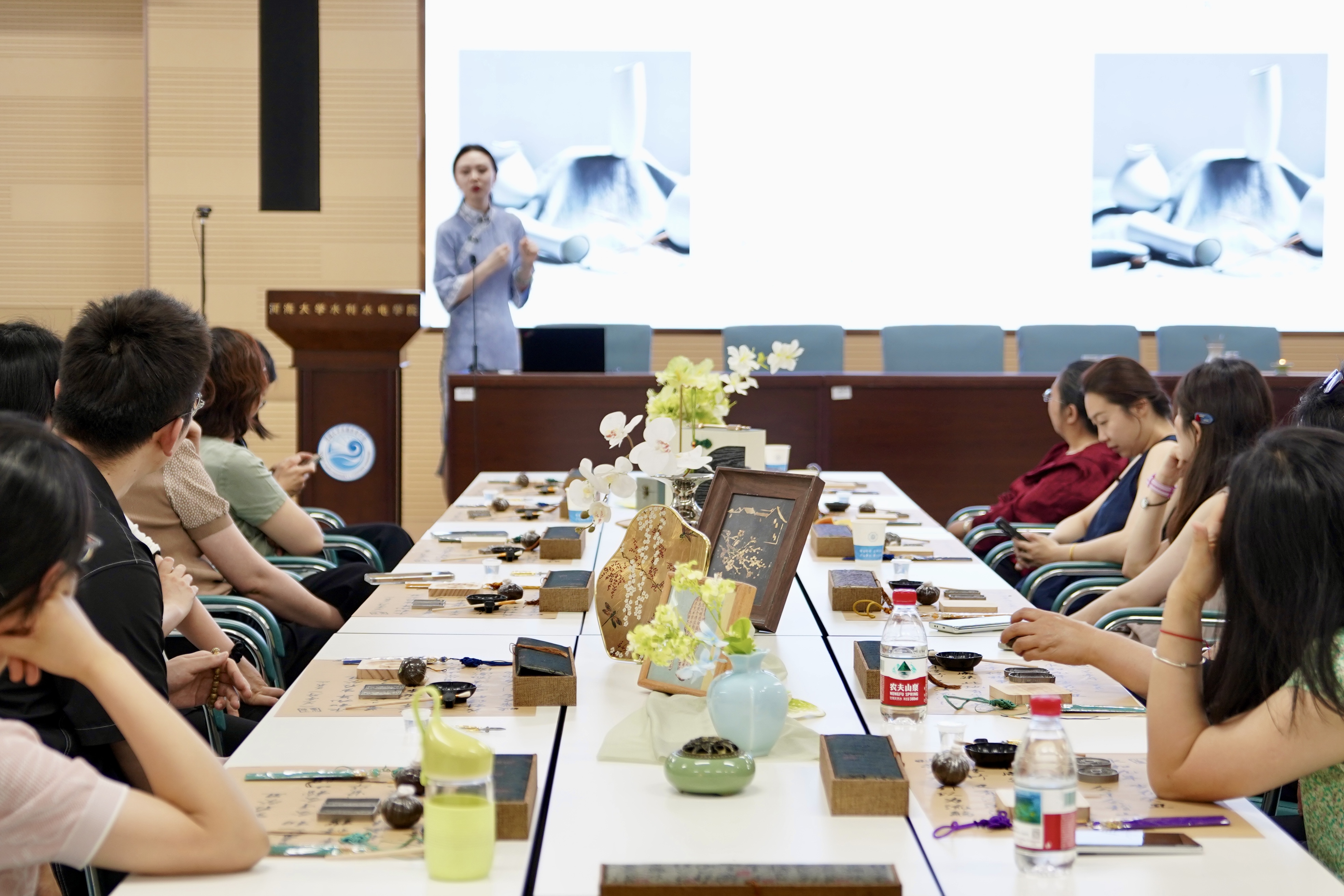 随后,老师带领大家步入博大精深的香文化殿堂。讲解深入浅出,从端午悬艾挂蒲、佩香禳毒的古老民俗智慧,到各类天然香料的特性辨识与养生妙用,再到传统香方中蕴藏的节气哲学与生活美学。尤其对艾草、沉香等端午标志性芳香植物的文化意涵与当代价值,进行了生动阐释,使老师们深刻理解了草木之香不仅愉悦感官,更是先民顺应天时、守护安康的智慧结晶。