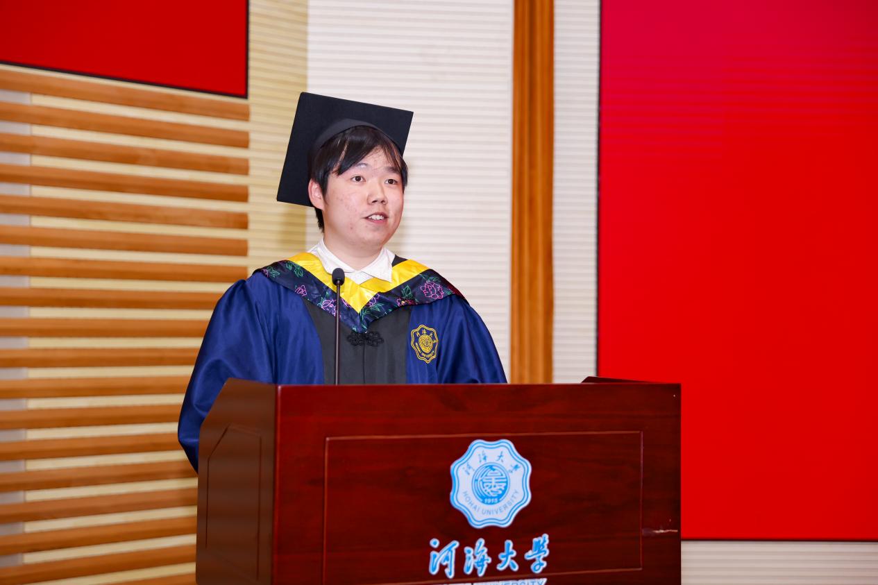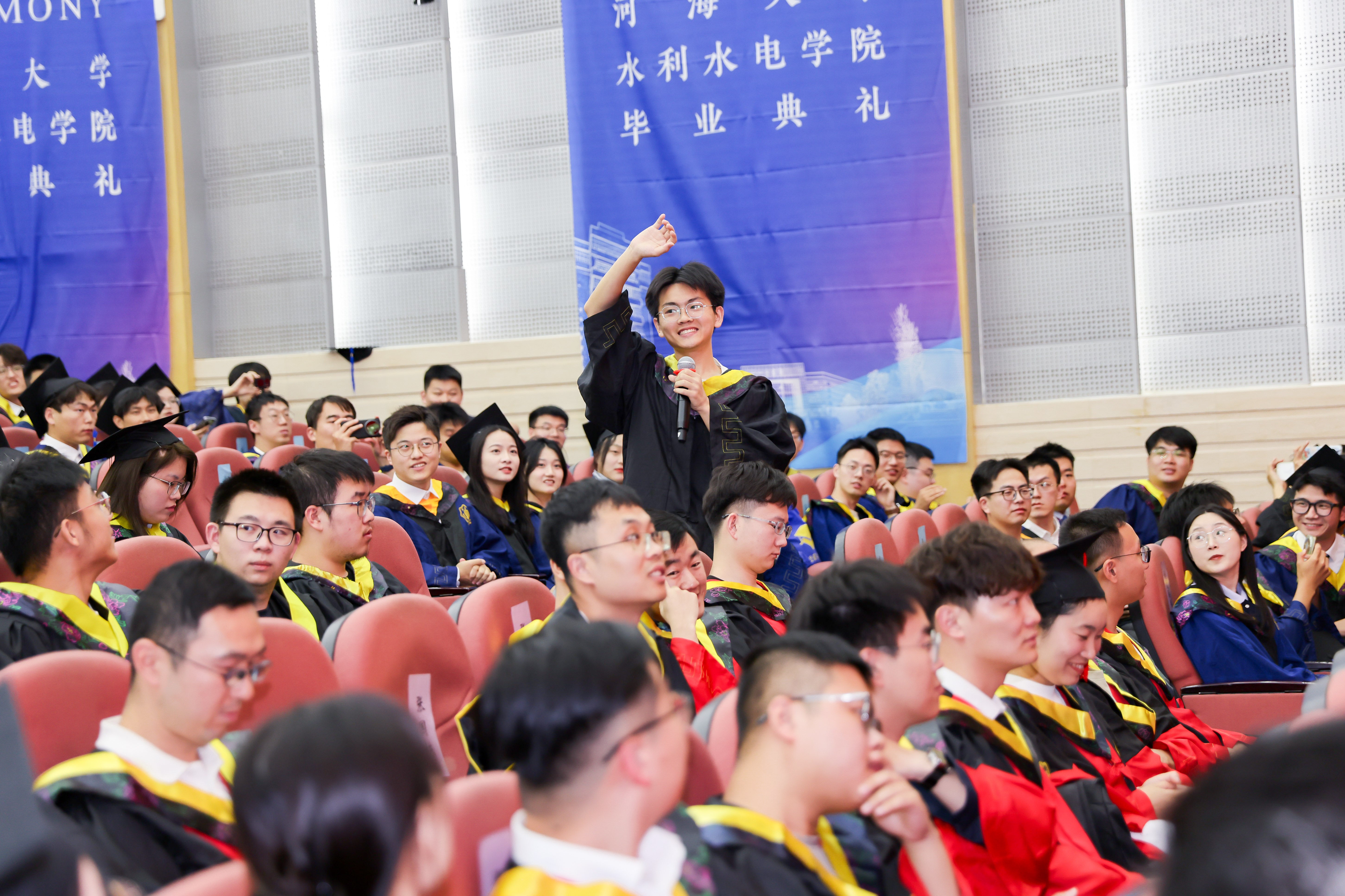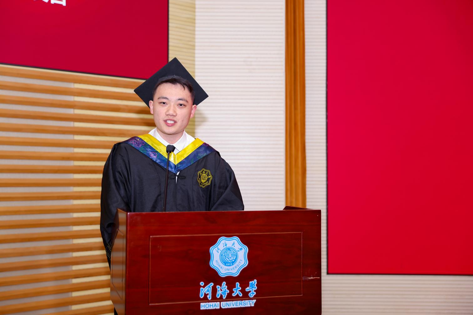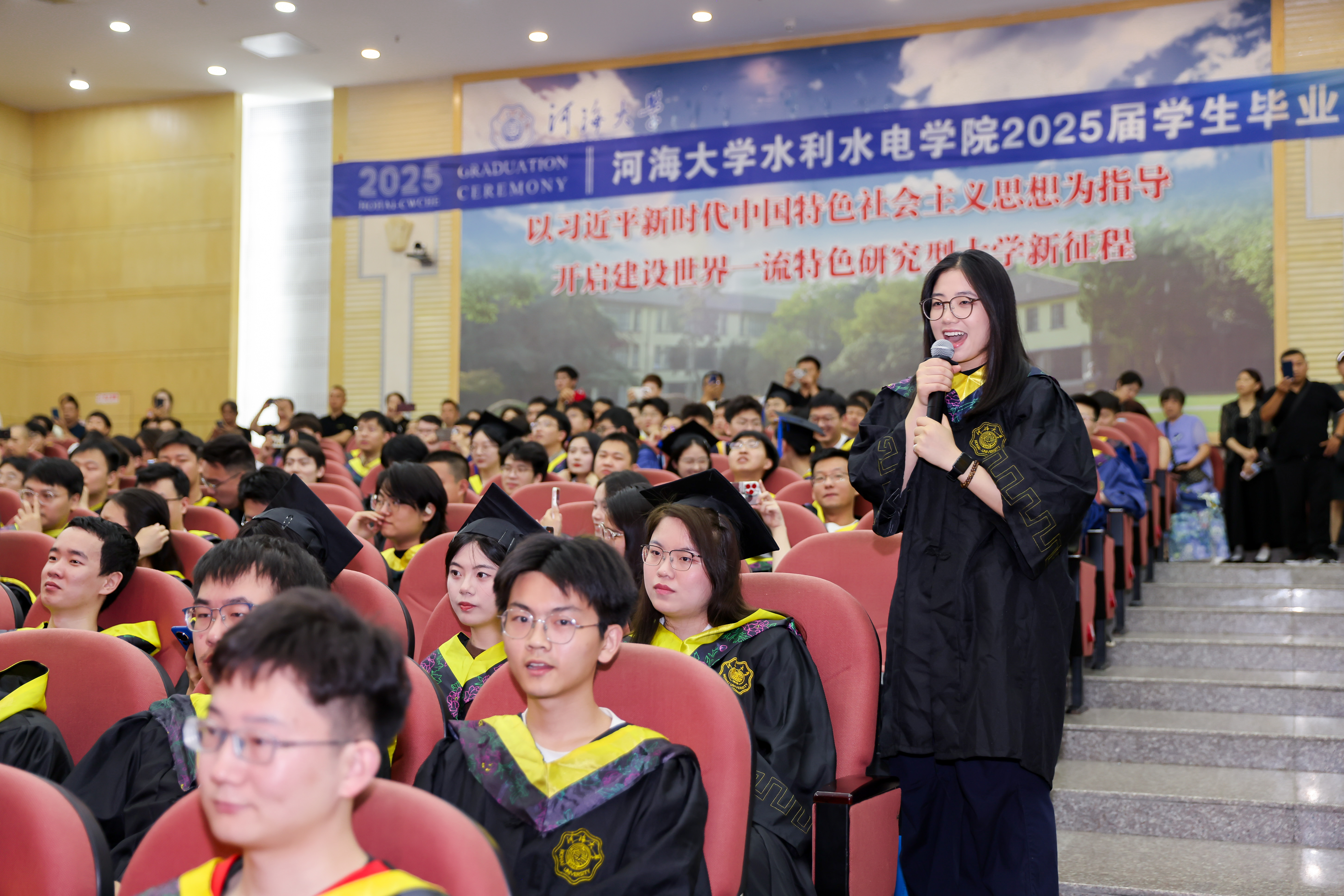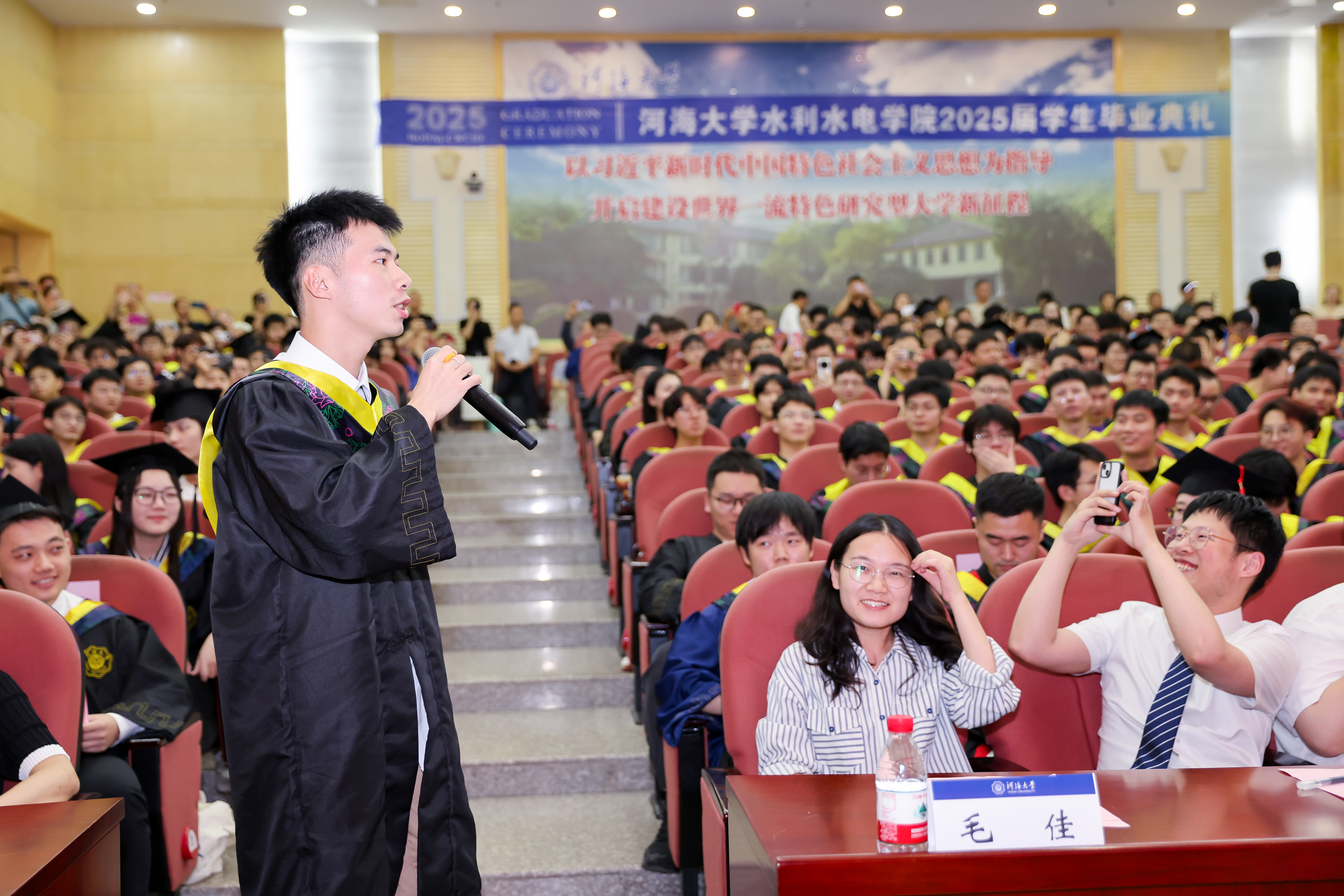 研究生毕业生代表王皓臻、本科生毕业生代表陈贤博先后发言,以求学点滴为引,分享了科研项目与竞赛的经历,讲述了专业学习与社会实践中的收获,感恩母校培养的严谨品格与家国担当,感恩老师给予的谆谆教诲,感恩同窗给予的深厚情谊,表达了对学校的惜别之情,祝愿高辣文 在学校110周年的新起点上,弦歌不辍,芳华永驻,再谱华章!未来无论身在何方都将以“水之子”的身份奋勇向前,谱写属于水利人的壮美诗篇!