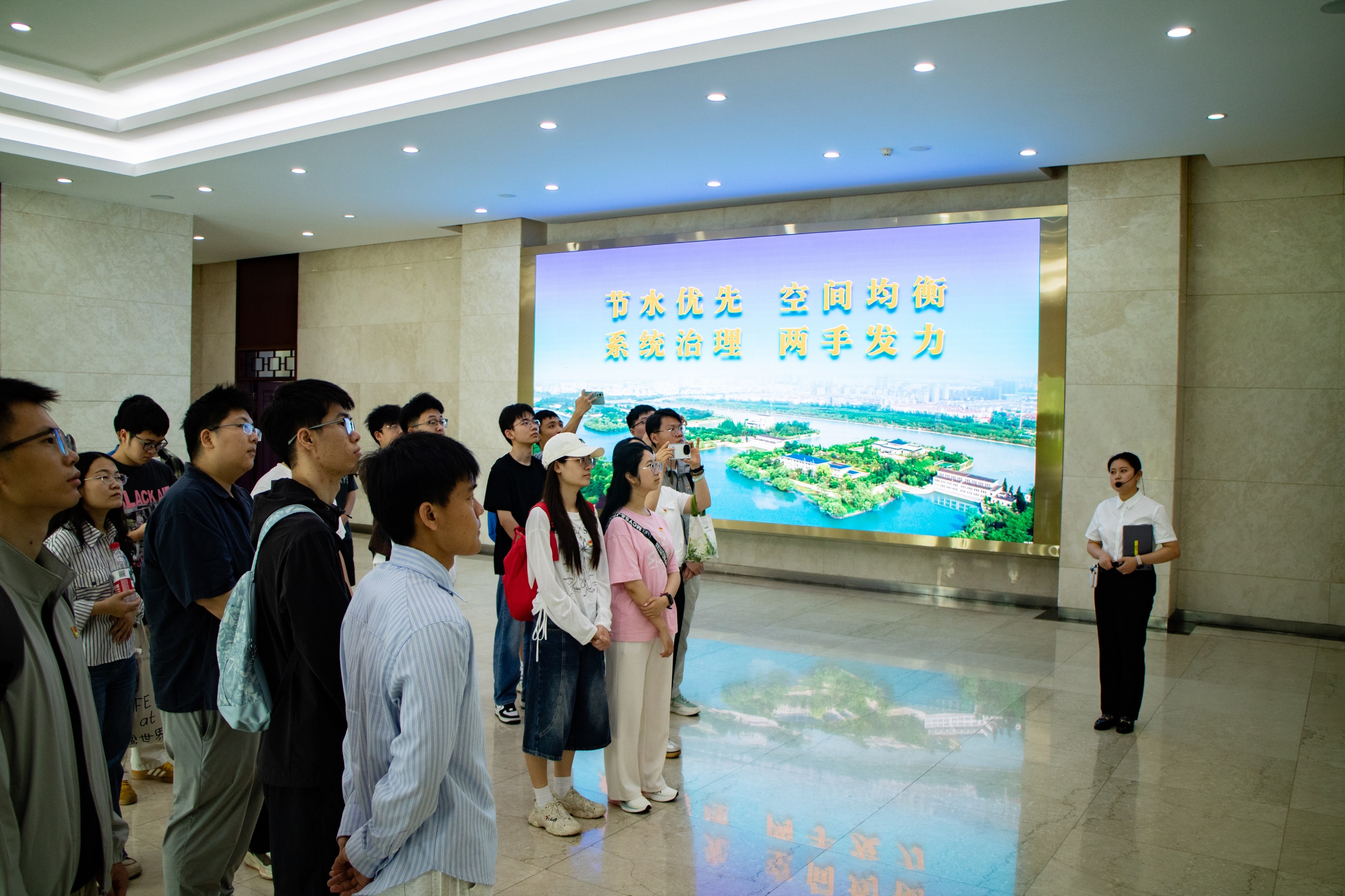 随后,大家走进南水北调东线江苏展示馆,深入了解南水北调这一国家级重大工程的战略意义与科技成就。展馆通过图文展板、沙盘模型与多媒体演示,全面展示了东线工程的建设历程、技术突破与生态效益。党员们深刻感受到我国在水资源调配、生态保护等方面的制度优势和科技创新能力,增强了投身国家战略工程的信心与决心。