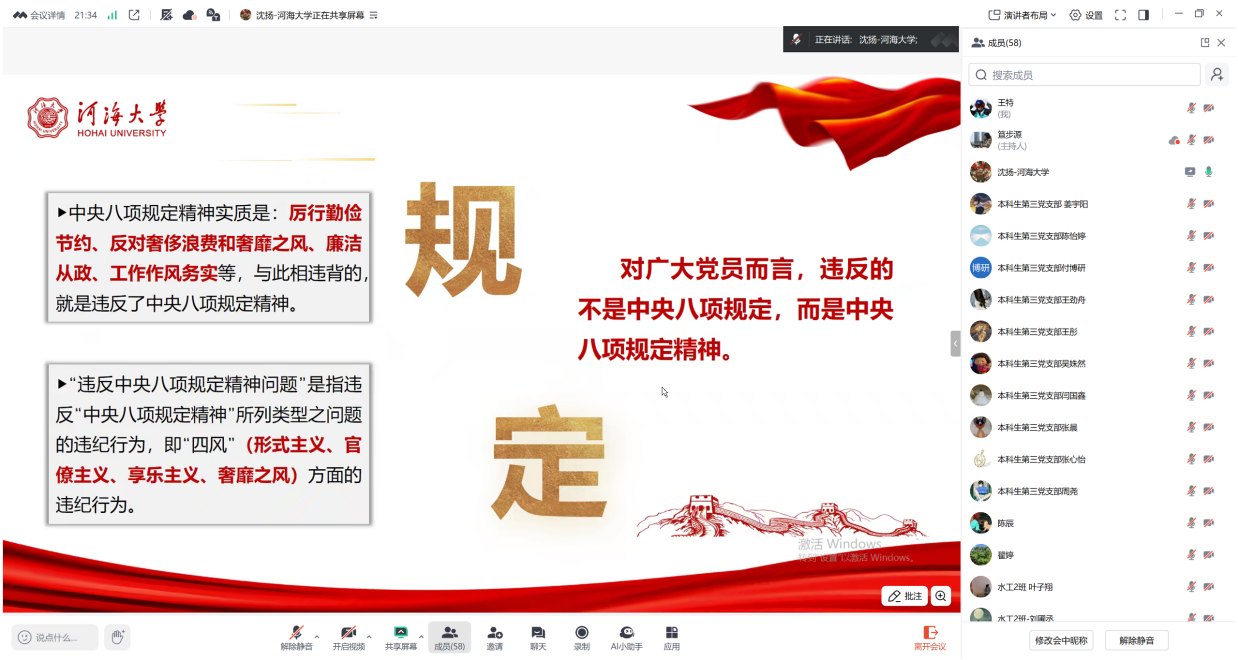 沈扬副校长以“何为中央八项规定及精神”为切入点,从“违反中央八项规定精神的具体表现、教育领域违反中央八项规定精神案例和传承百十河海光荣传统弘扬优良作风”三个方面展开党课。沈校长强调,中央八项规定是党的十八大闭幕后,在习近平总书记召开中央政治局会议当中所通过的一个重要的规定,涵盖改进调查研究、精简会议活动、规范出访等八方面内容,是自上而下改进作风的示范。而中央八项规定精神则是对全党同志的共同要求,是一系列符合中央八项规定内涵的政策规定的统称,其核心实质为“厉行勤俭节约、反对奢侈浪费、廉洁从政、务实工作”,与“反四风”紧密相关,是每一名党员都应当遵守的要求和最基本底线。