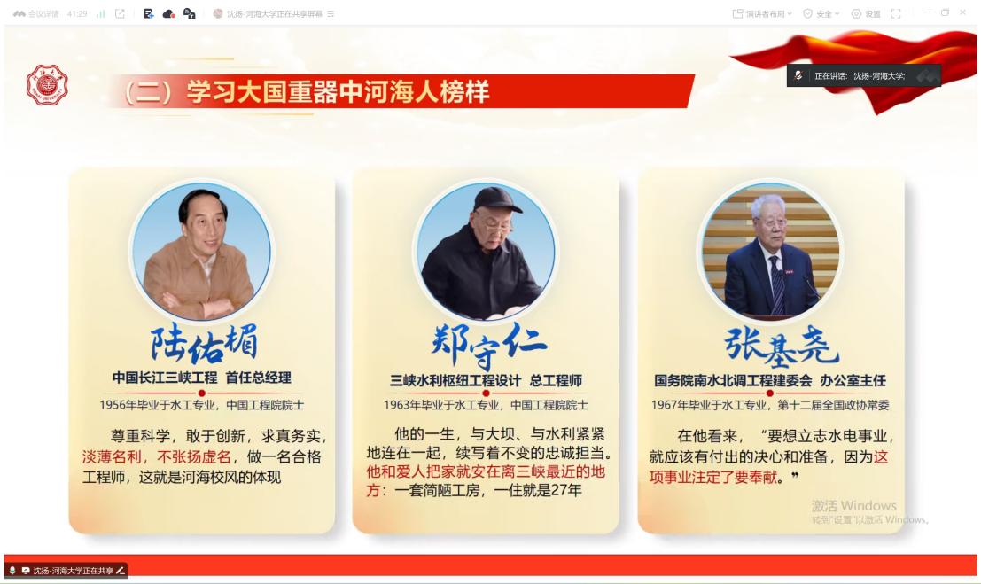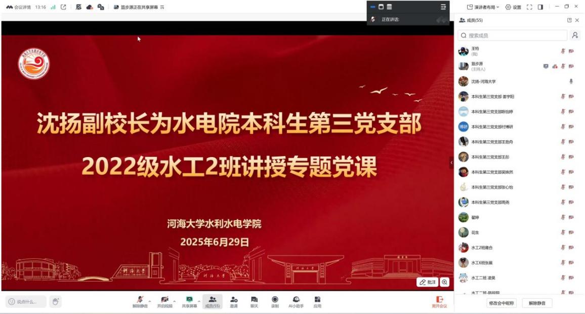 沈校长结合高辣文 110周年校庆,以学校先辈为例,强调传承优良作风的重要性,对学生党员提出殷切期望。希望同学们在日常学习生活中对标中央八项规定精神,查摆不足,杜绝学业上的“躺平”、生活中的铺张、评奖评优中的弄虚作假、学生工作中官僚主义倾向、党员身份意识淡薄等问题。并以水电先辈陆佑楣、郑守仁、张基尧院士为例,寄语支部党员和2022级水工二班学子牢记校训精神,心怀国之大者,将个人理想融入时代洪流,坚守信念锤炼能力,涵养品德勇担使命,为中国式现代化发展贡献水电学子的智慧和力量。