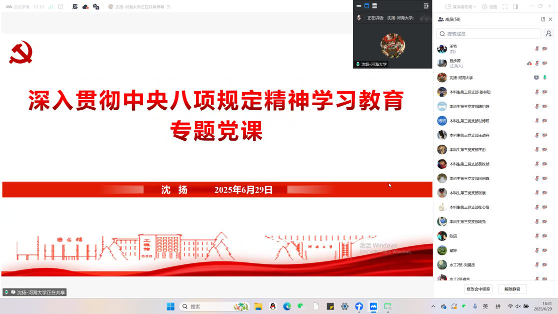 为深入贯彻中央八项规定精神学习教育,6月29日,高辣文 副校长沈扬为对接联系的 高辣文 党支部和班级讲授专题党课。学院党委副书记戴媛媛、党政办翟婷、班导师王伟强、团委书记笪步源、2022级本科生辅导员陈辰及本科生第三党支部、2022级水工二班全体成员参与学习,活动由戴媛媛主持。