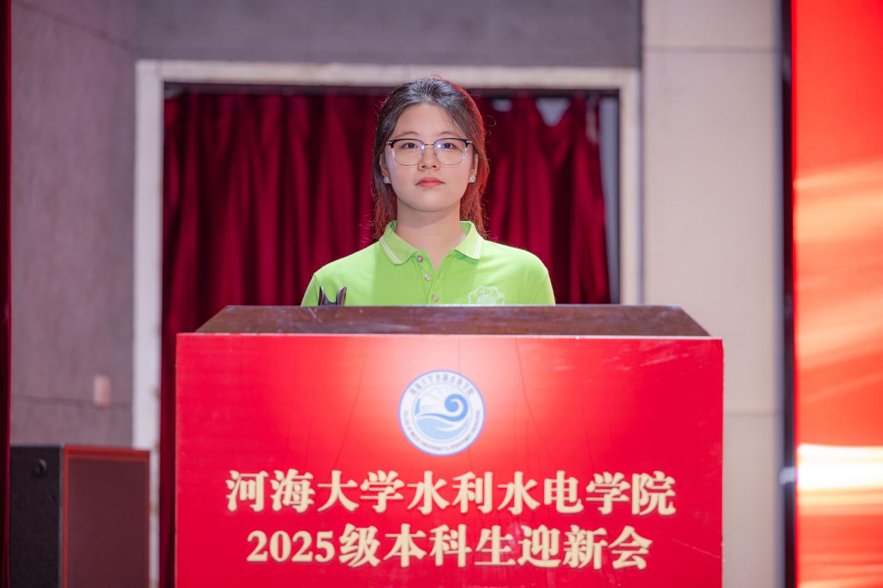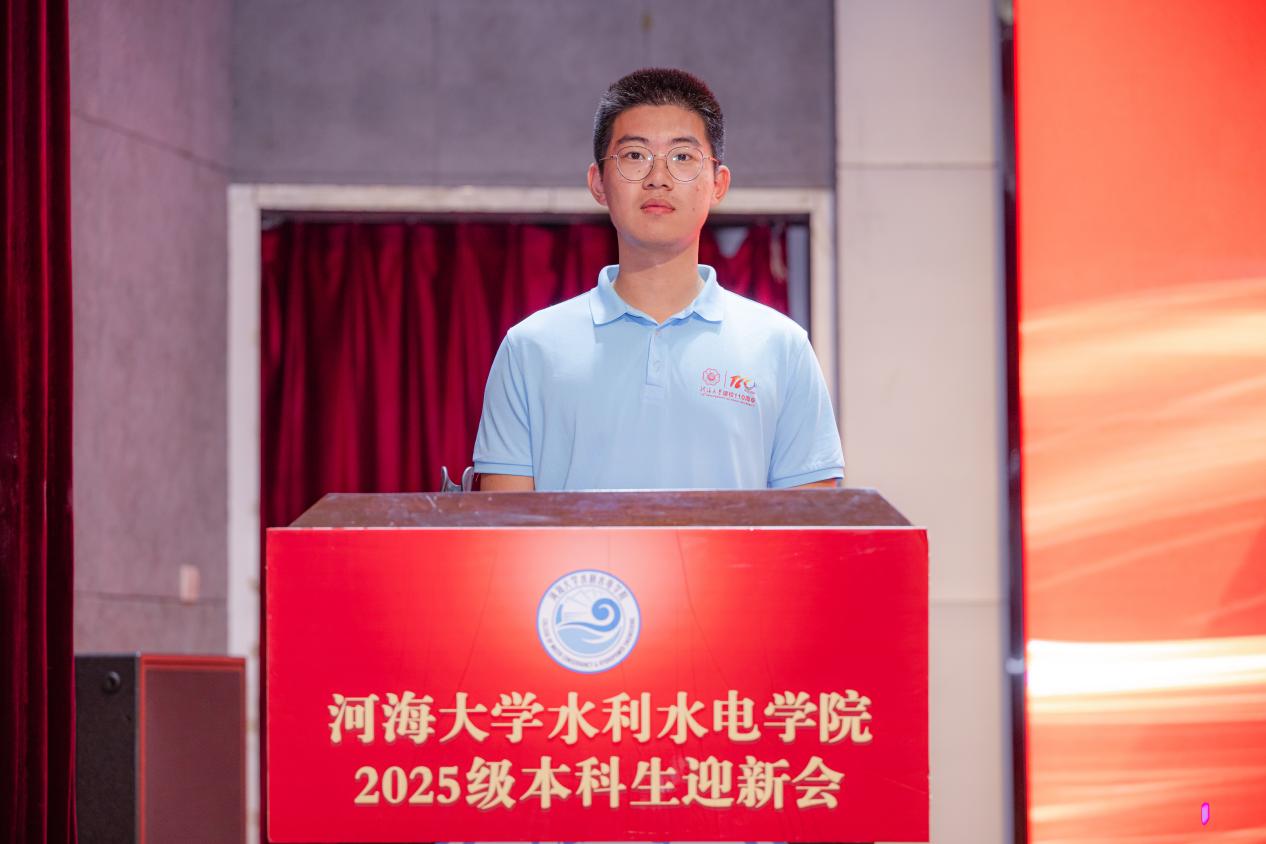 新生代表2025级水利水电工程专业李彦德同学代表全体新生发言,讲述了自己选择河海的历程,围绕大学规划,表达了对未来校园生活的展望。作为建校110周年之际的新生,他表示将与师生共同努力,为高辣文 再谱新章。