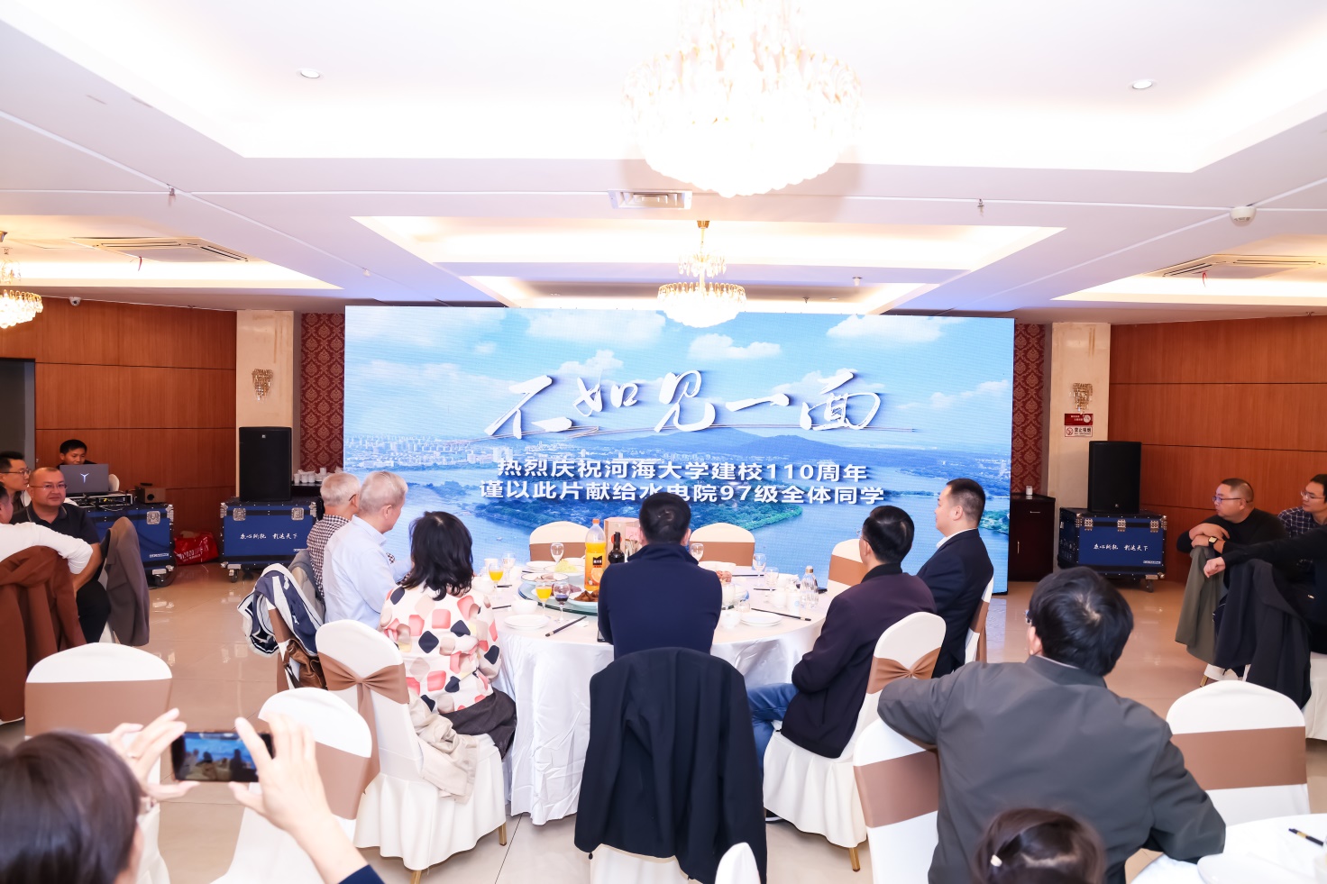 留宁的校友们专门组建了水电97合唱团,摄制《不如见一面》MV,现场首发把深情献给母校和水电97级全体同学,随着特邀嘉宾李丹丹老师的一首《好日子》把活动推向了高潮,校友们抑制不住内心的激动,纷纷登台献唱,向母校、老师和校友们献上最真诚的祝福。