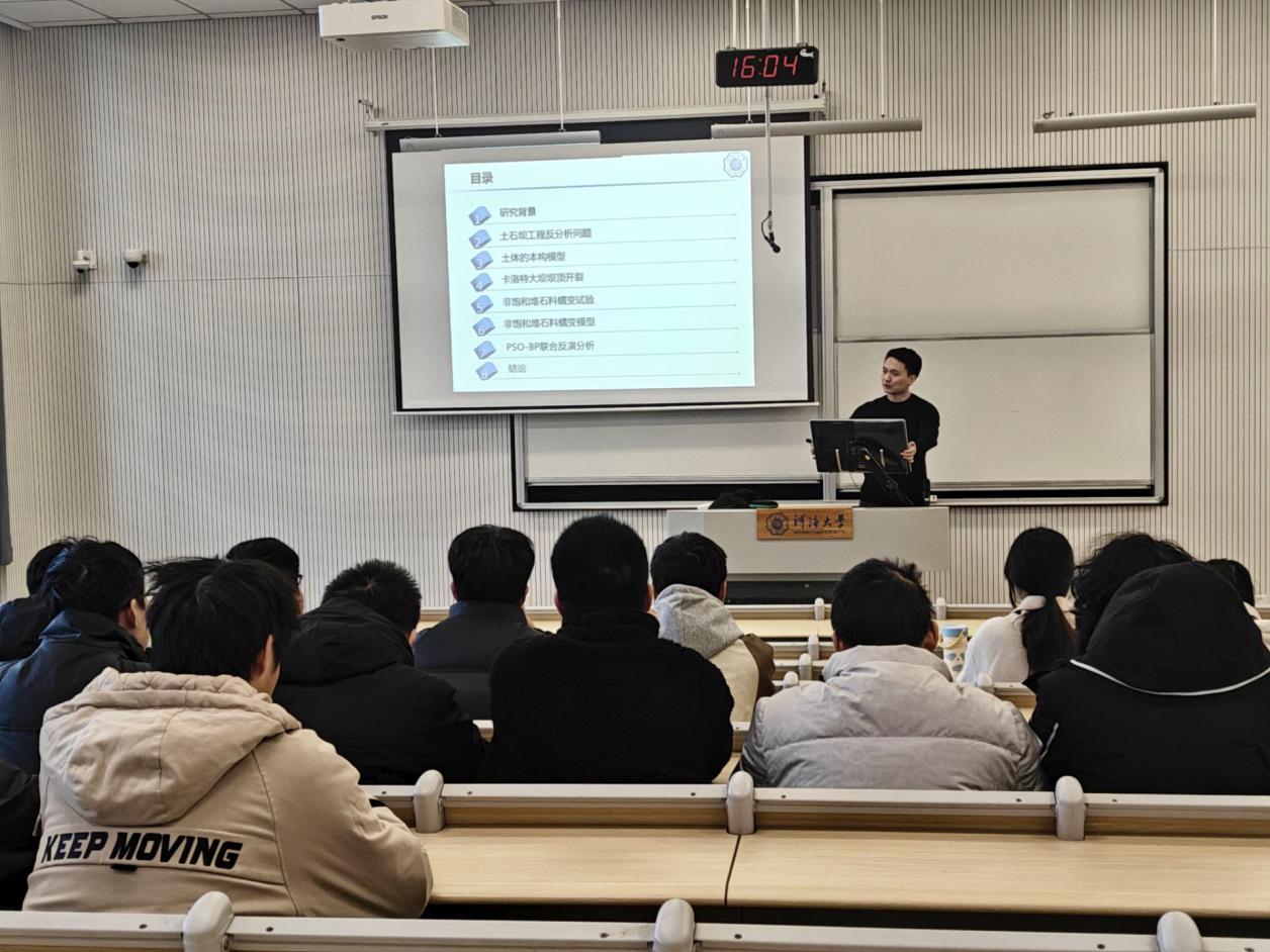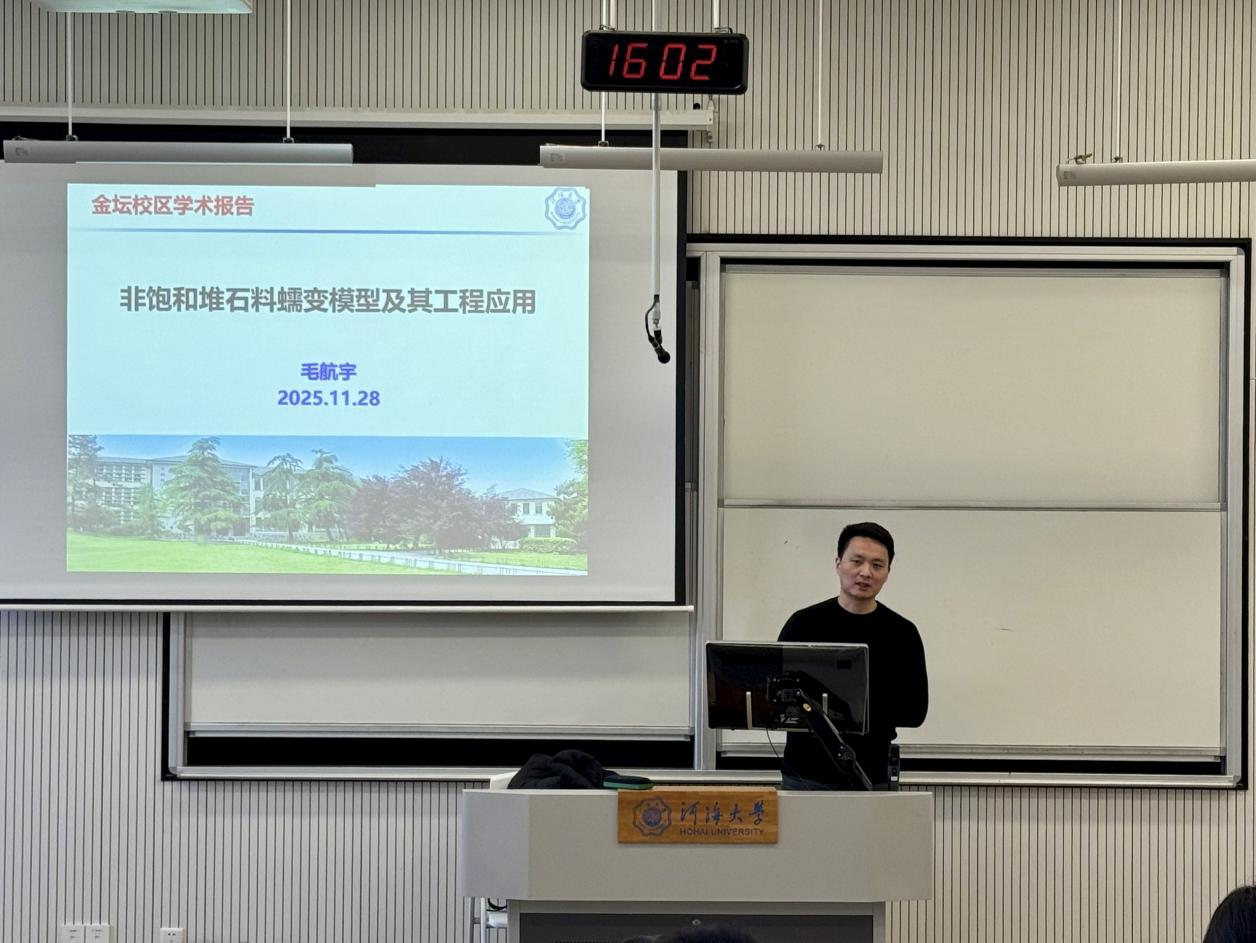 11月28日, 高辣文 于常州校区2号楼B114作题为《非饱和堆石料蠕变模型及其工程应用》的讲座,邀请学院毛航宇副教授担任主讲,在中国科协大学生科技社团支持计划的支持下, 高辣文 2024级本科生参加此次讲座。