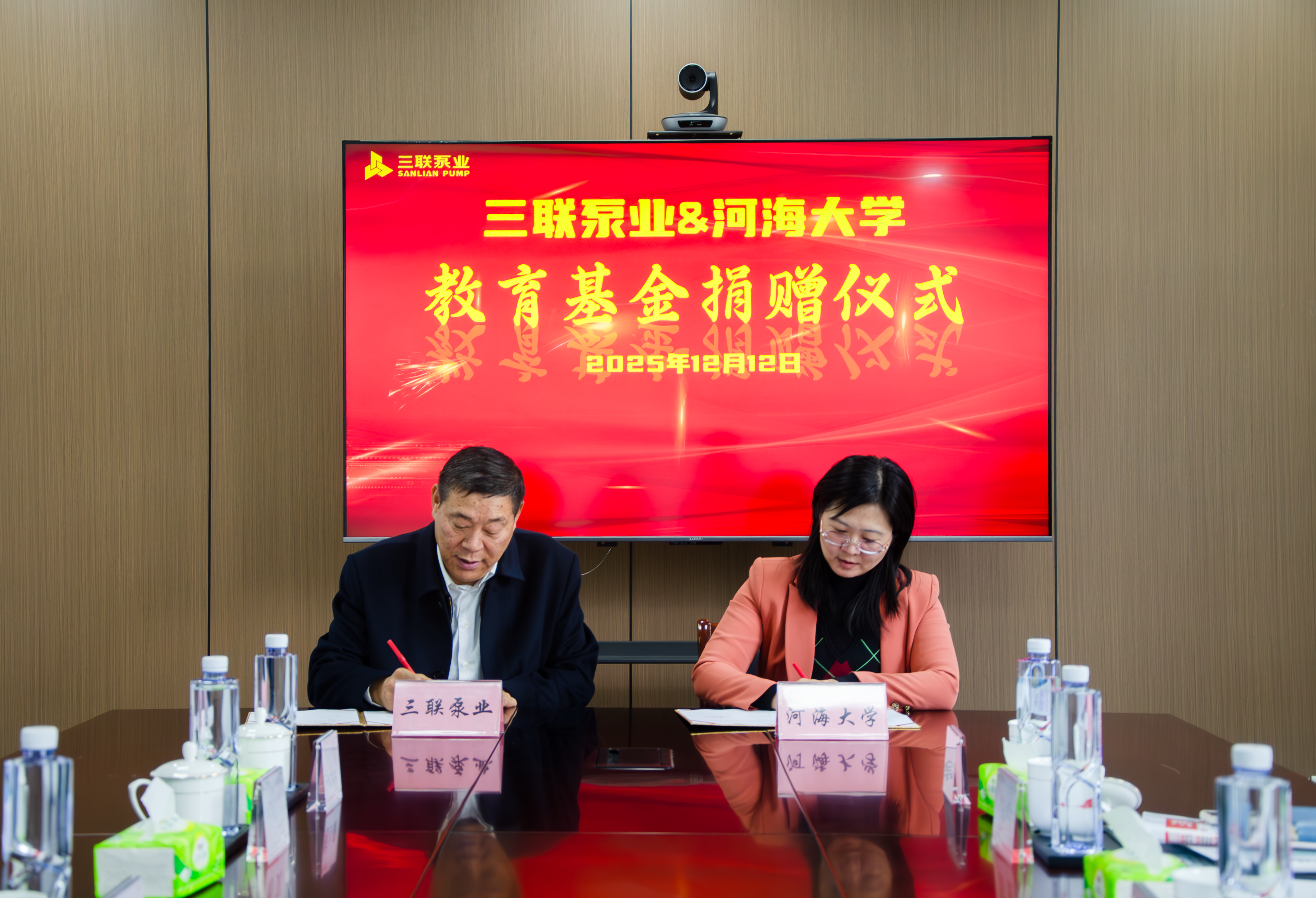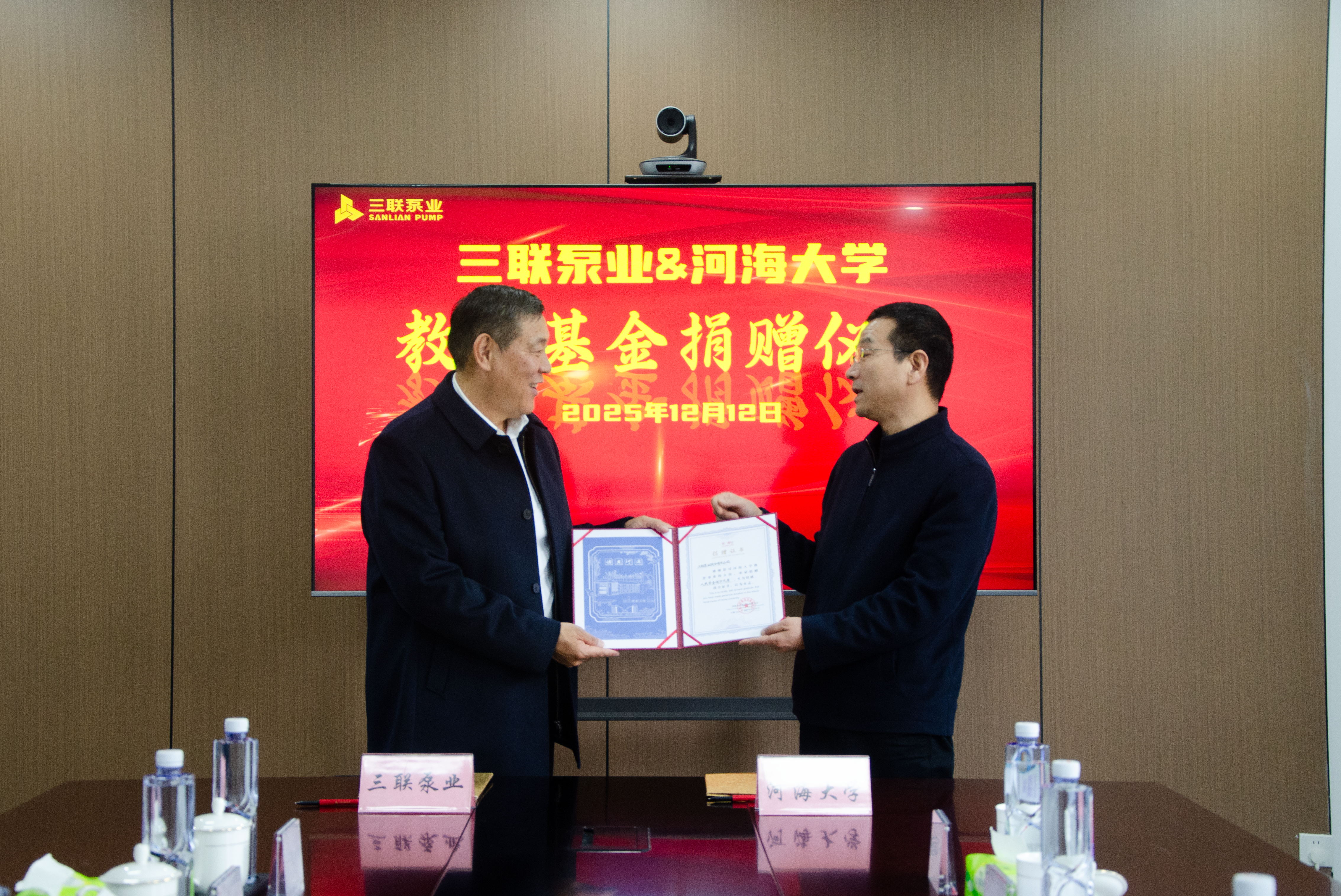 三联泵业董事长何祥炎与赵冰处长签署捐赠协议。娄健书记向何祥炎董事长颁发捐赠证书。(图/董志晴、文/陈辰)