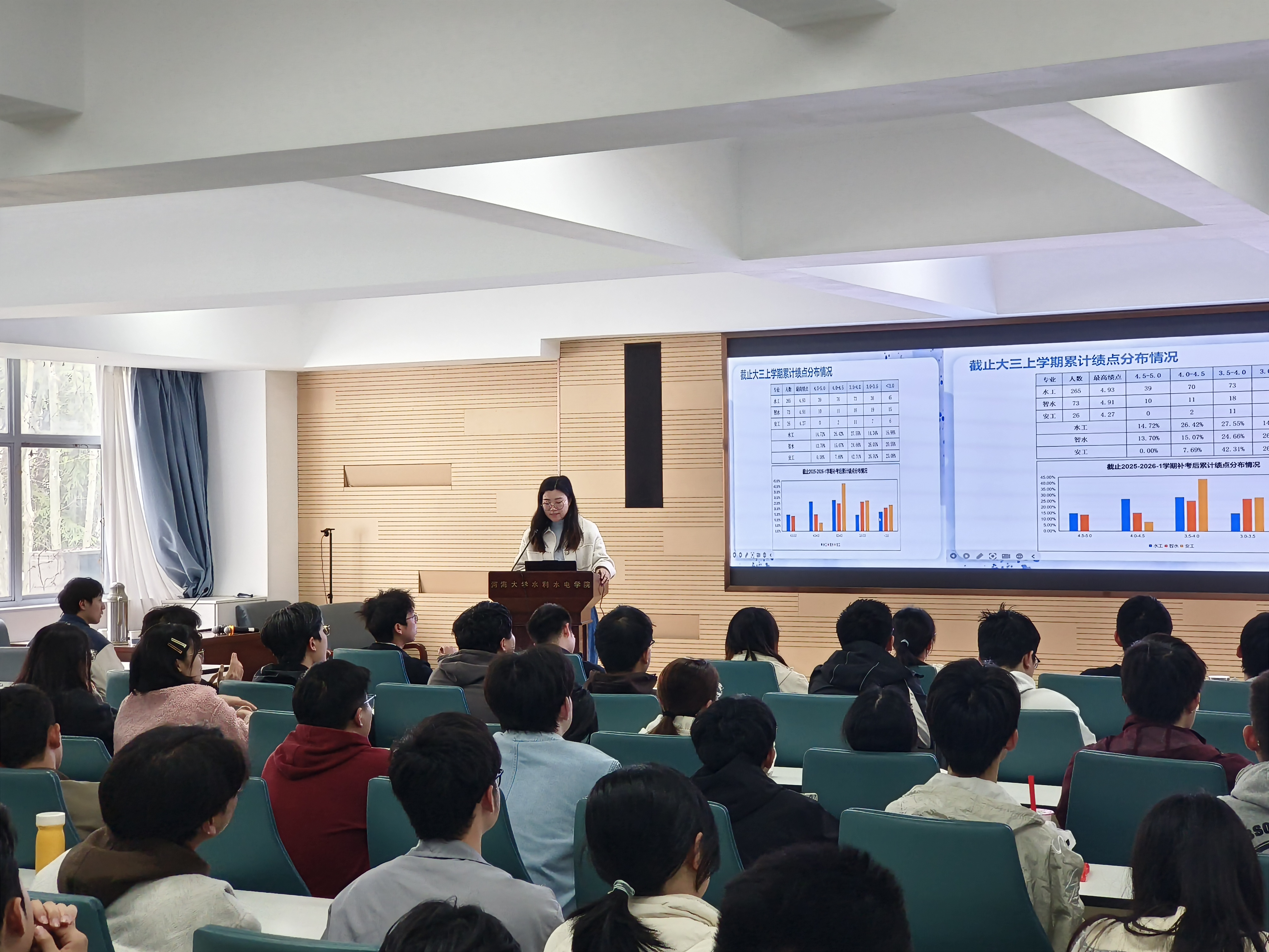 会上,帅雨婷围绕年级学业整体情况开展全面复盘与深度分析,以数据图表直观呈现成绩分布、优秀学子风采、专业成绩差异及课程重难点,系统梳理学风建设成效。她充分肯定全体同学在基础课程学习中付出的努力与取得的成果,客观指出部分同学在核心重难点科目中存在的薄弱环节,结合历年数据纵向研判大三下学期学业关键挑战。她强调,大三是学业发展的重要分水岭,更是综合能力提升的黄金窗口期,勉励全体同学正视差距、补齐短板、夯实根基,以扎实学风筑牢成长基石。